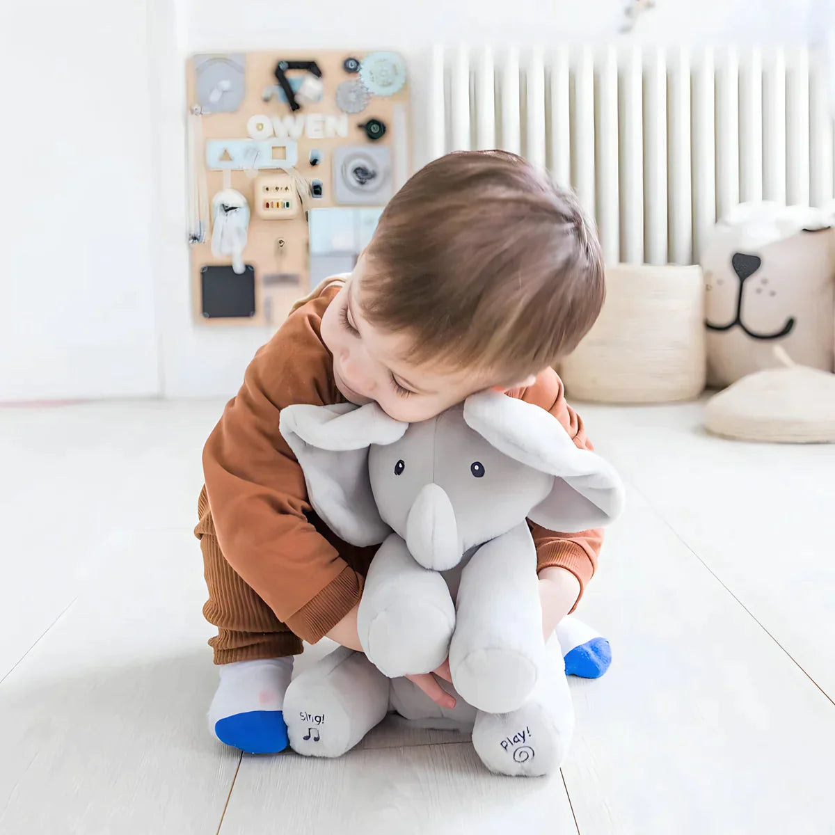 Ultimate playtime buddy for your little one! With its plush body friendly face and interactive charm is guaranteed to capture your baby’s heart. Watch in delight as you press the button and its ears flap open revealing a fun peekaboo surprise. Complete with melodic songs and cute phrases this lovable elephant is the perfect playmate for your baby’s joyous adventures!