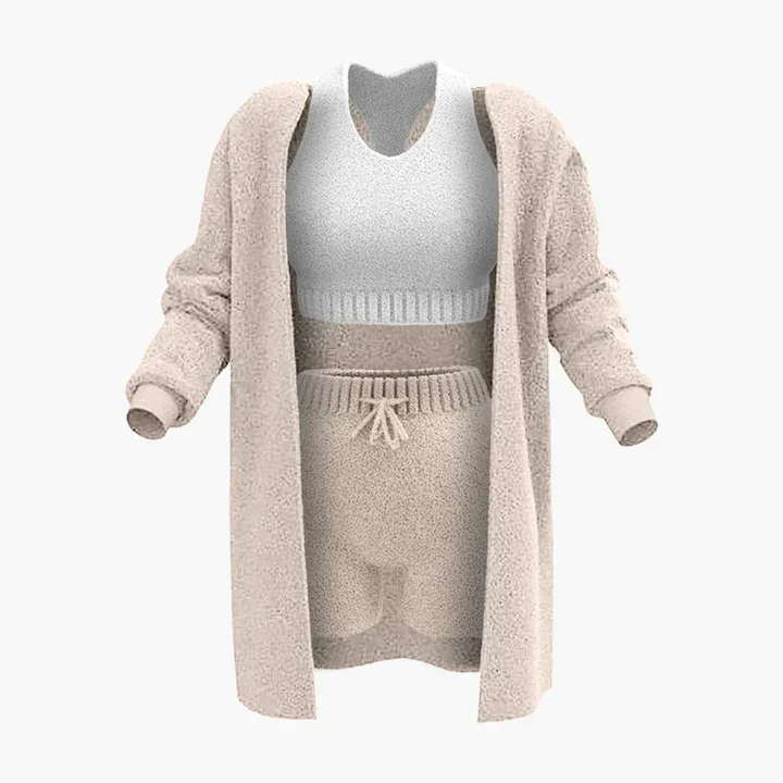 This matching 3-piece set includes a long sleeve cardigan cropped tank and high waist shorts all handmade from soft stretchy boucle yarn.